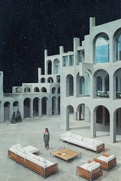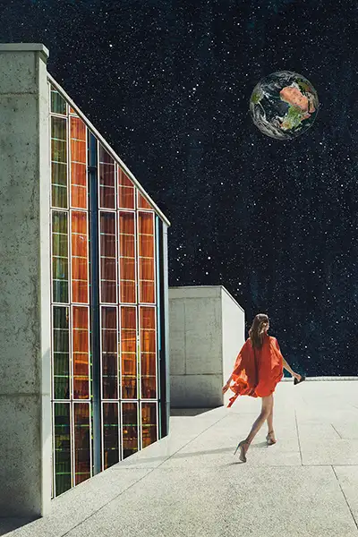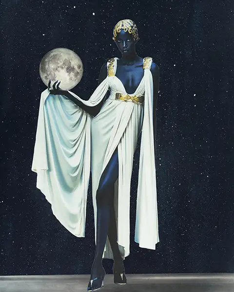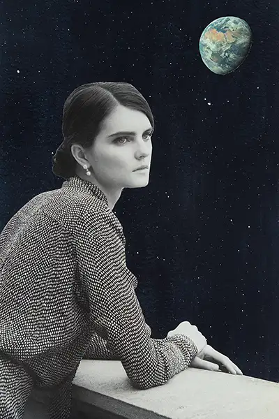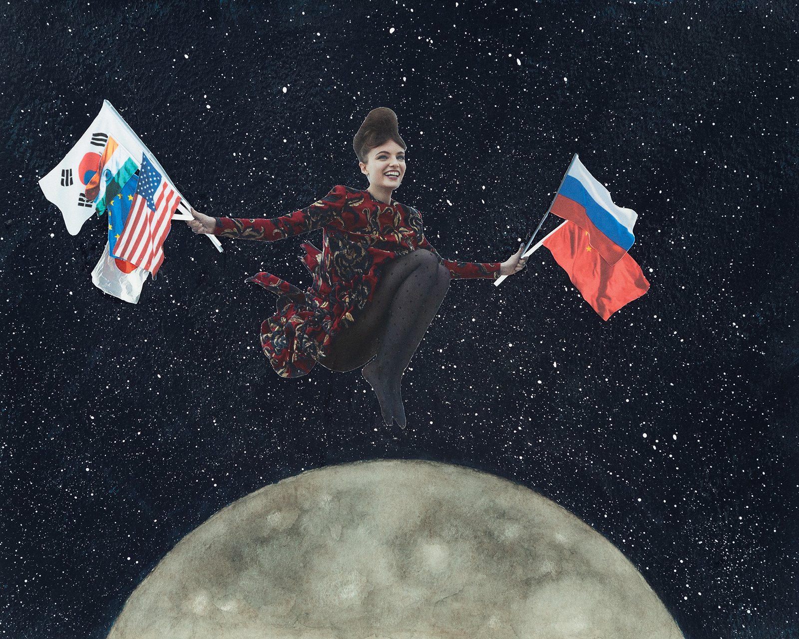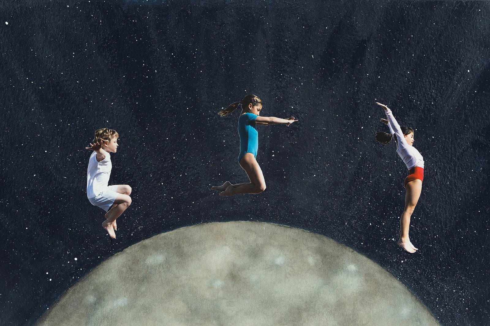 Las obras presentadas se han realizado mediante la técnica del fotomontaje o collage. Sobre papel de acuarela pinto los fondos con pintura acrílica y en algunas de ellas también la Luna con acuarelas. Después construyo las imágenes con recortes de fotografías extraídas de revistas o conseguidas en internet.