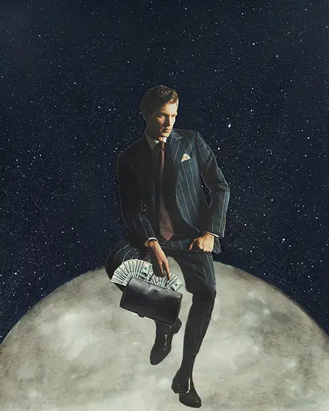 “¡Hasta la luna!” es una sátira sobre la posible colonización y explotación comercial de la Luna. Es el primer capítulo de una serie de trabajos que versan sobre el espacio ultraterreste y las intenciones incipientes de su colonización por parte de la espacie humana. El segundo capítulo previsto es “Marte”.